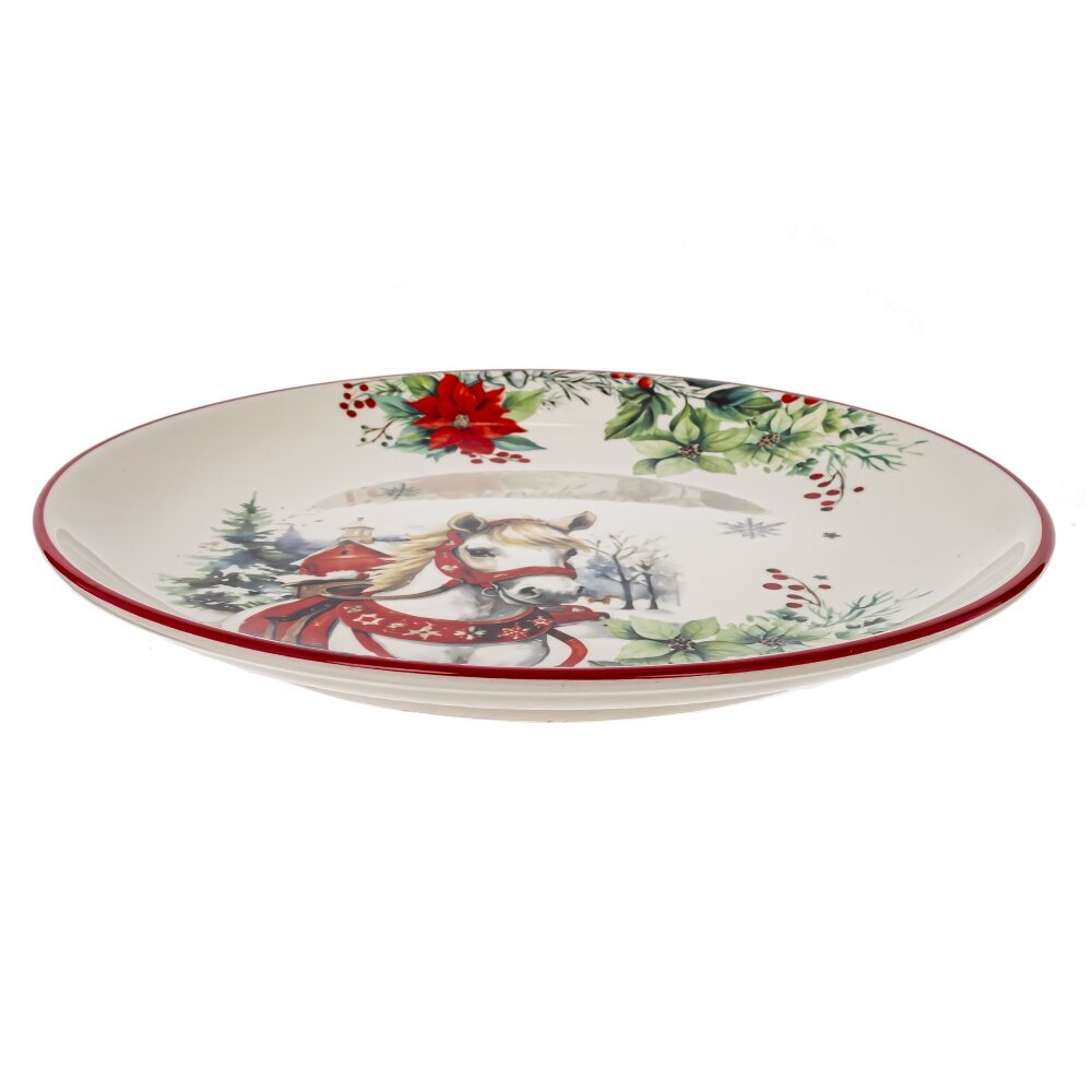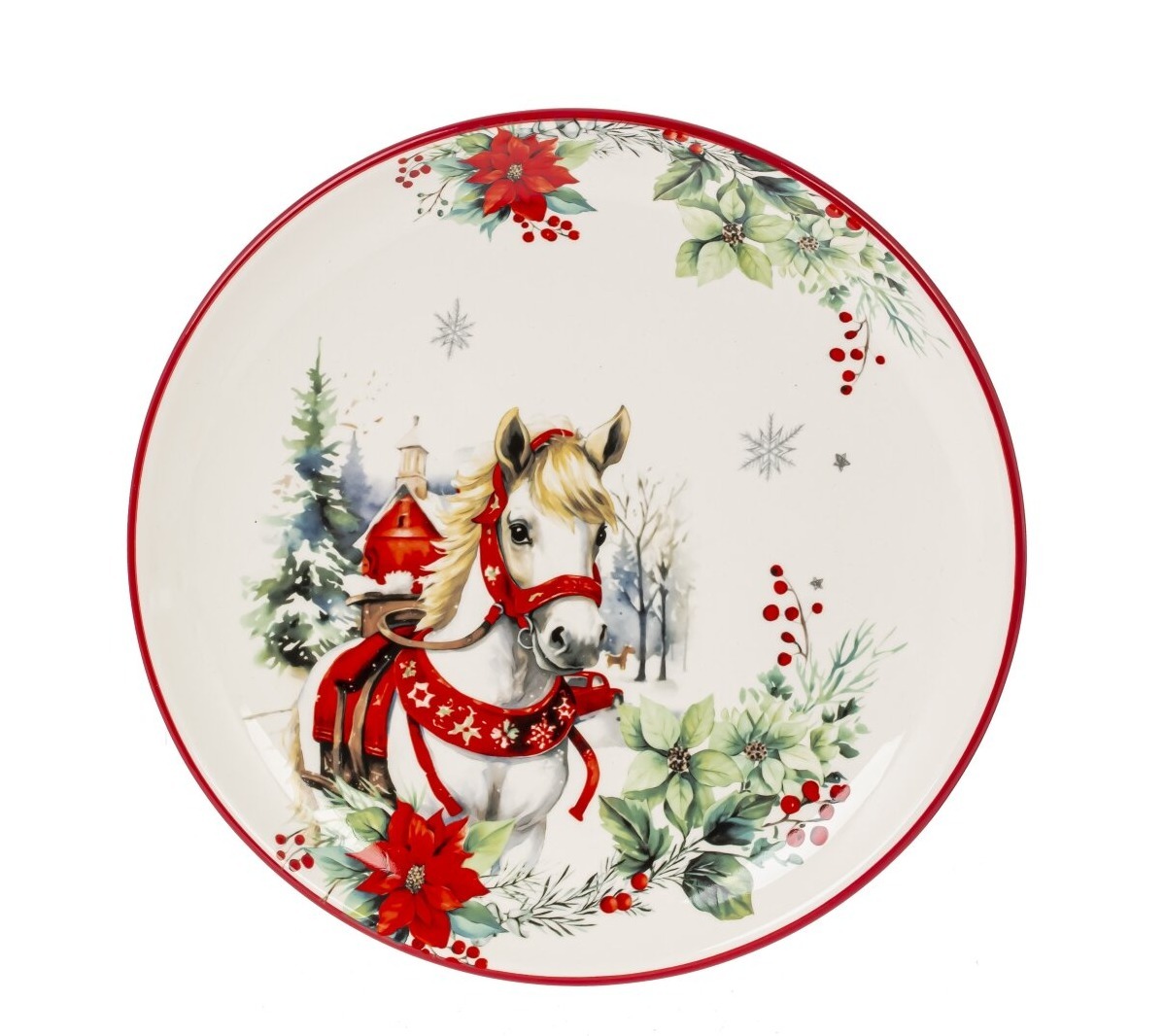 Праздничная тарелка с новогодним декором и символом 2026 года — изящной лошадкой — станет прекрасным дополнением праздничного интерьера или оригинальным подарком к Новому году. Изготовлена с вниманием к деталям, она украшена яркими зимними элементами: снежинками, веточками и праздничными акцентами, создающими волшебное настроение. Тарелка упакована в стильную подарочную коробку, что делает ее готовым решением для подарка родным, коллегам или друзьям.