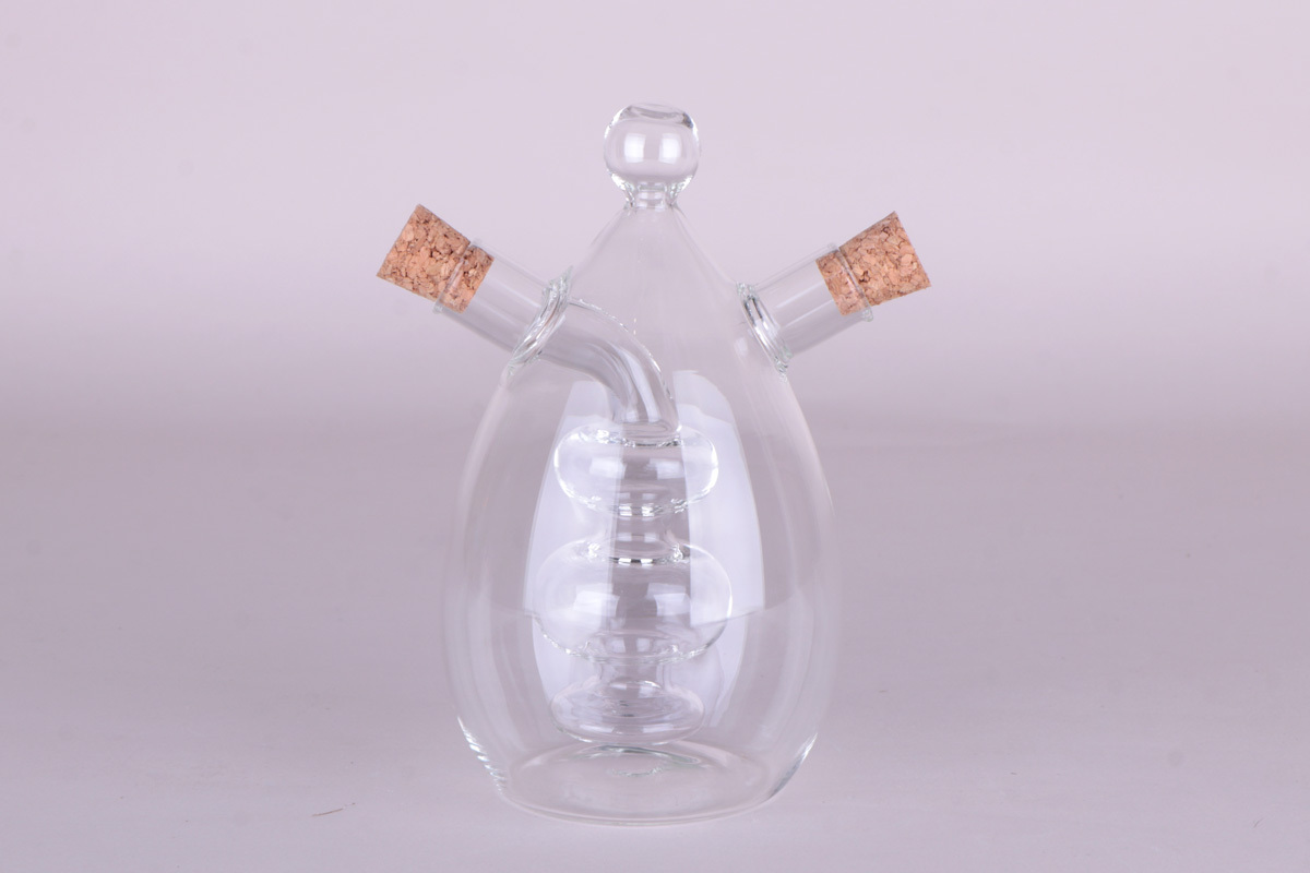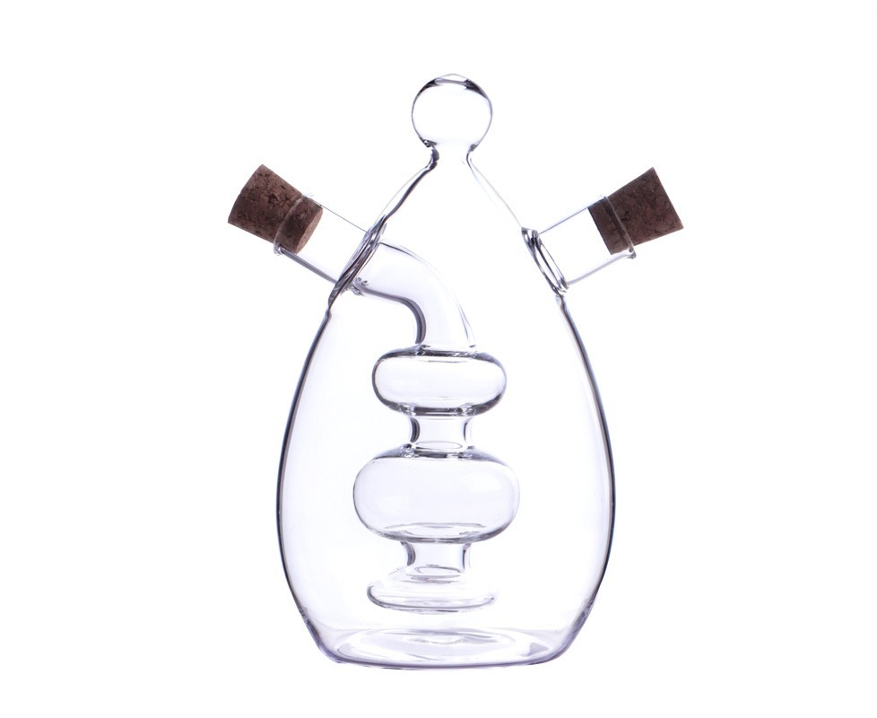 Ёмкость для масла выполнена в виде двух сосудов, находящихся один в другом. При заполнении контрастными по цвету жидкостями, такую бутылку можно считать предметом декора, а не просто кухонным инвентарем.