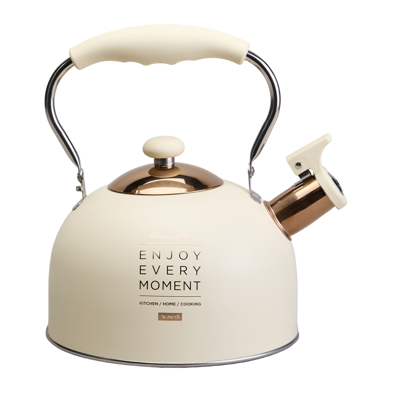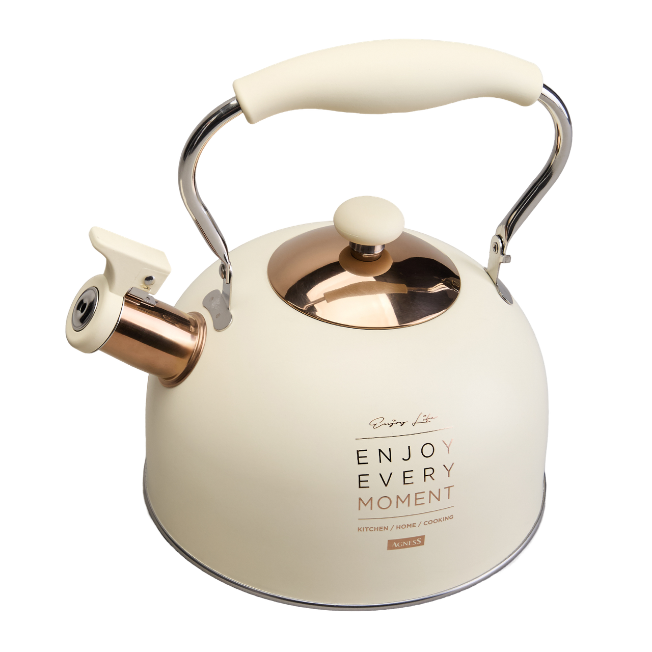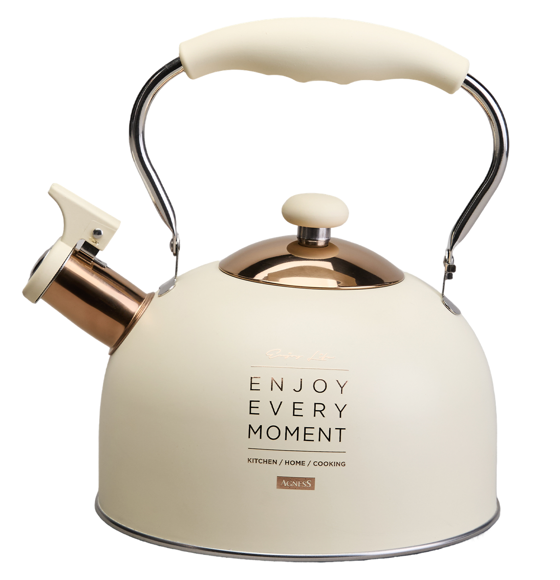 Чайники со свистком Agness — это надежность, функциональность и стильный дизайн. Чайник выполнен из нержавеющей стали — наиболее прочного и гигиеничного материала. То есть изделие в процессе использования, не выделяет вредных веществ в воду, не меняет ее вкус и не поддается коррозии. Чайник способен сохранять тепло гораздо дольше чем другие модели.