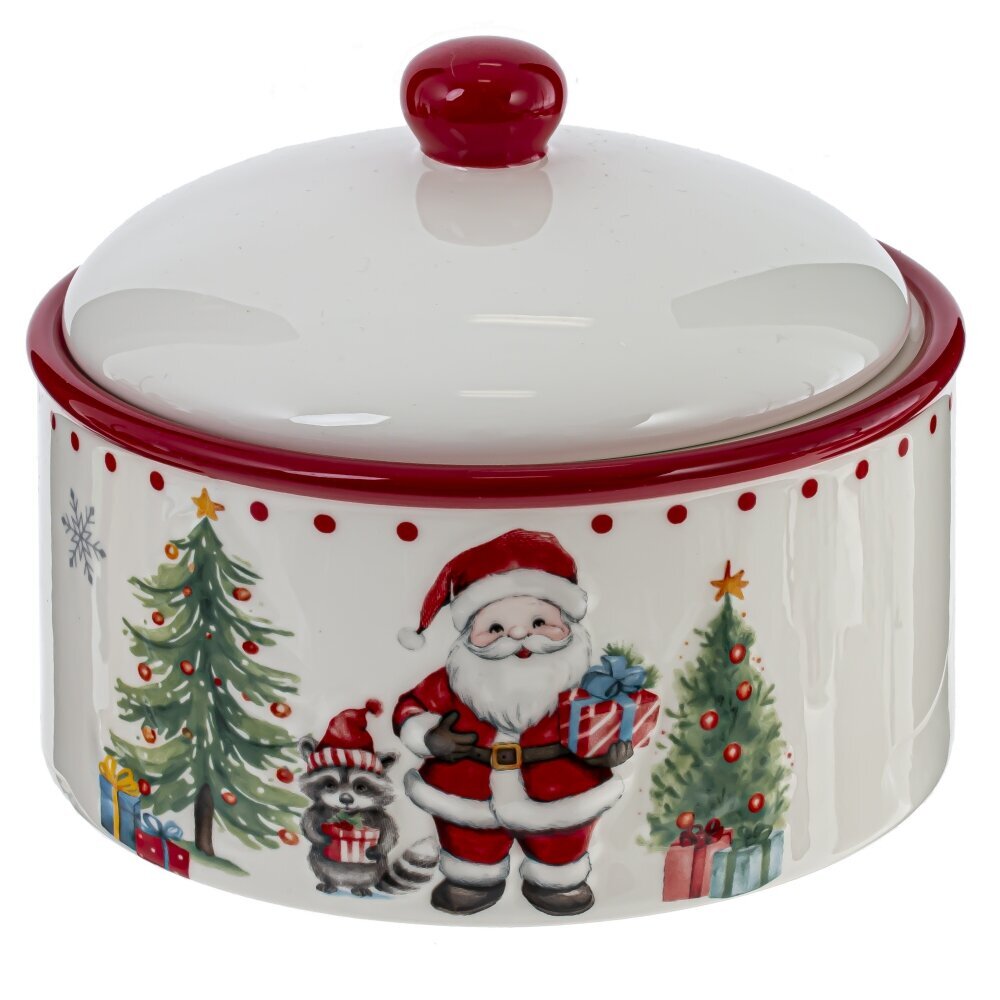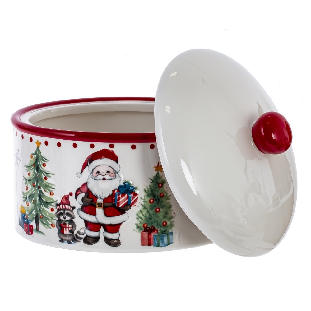 Керамическая сахарница "Новогодний подарок" на 900 мл с праздничным рождественским дизайном. Она выполнена в красно-белой цветовой гамме с крышкой, на вершине которой расположена ручка. Тело сахарницы украшено изображениями Санты с енотом на фоне рождественских елок. Эта сахарница станет прекрасным украшением на праздничном столе или прекрасным подарком.