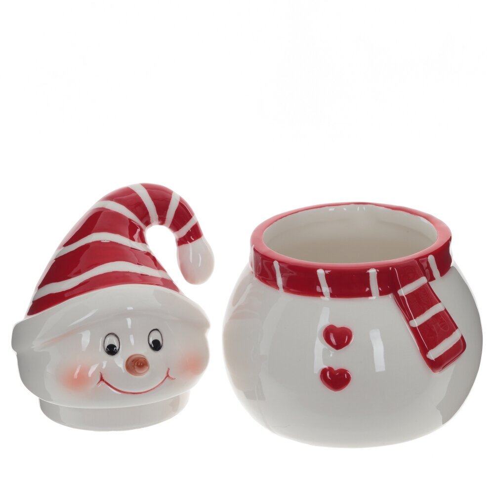 Керамическая емкость выполнена в виде снеговика с милой мордашкой. Она украсит новогоднюю сервировку стола и непременно поднимет настроение гостям.