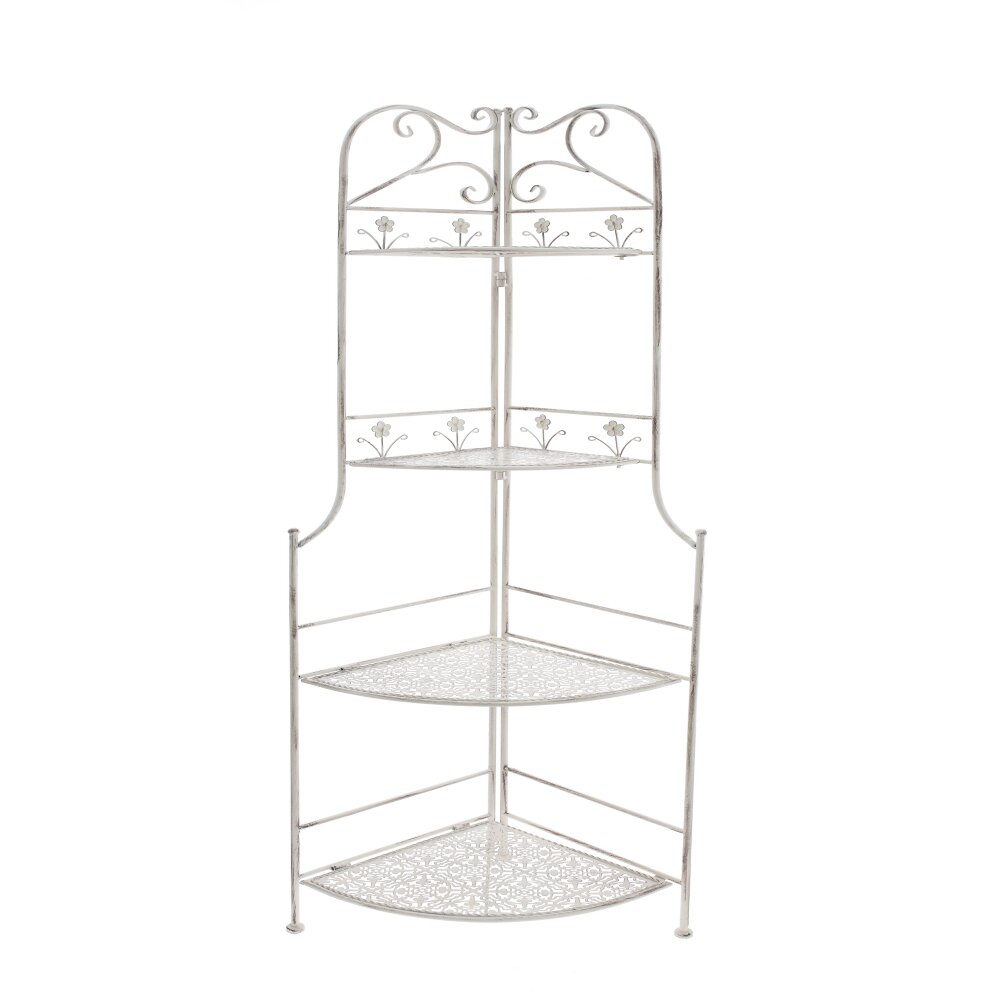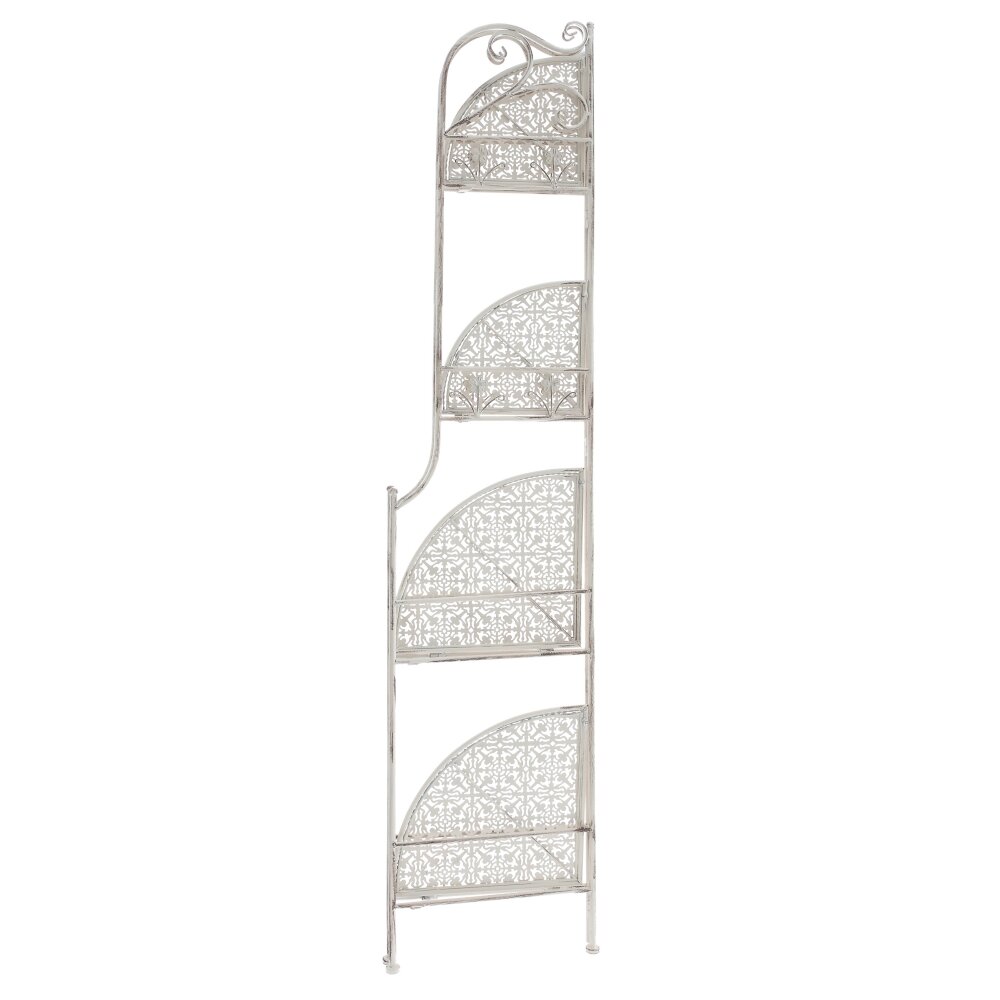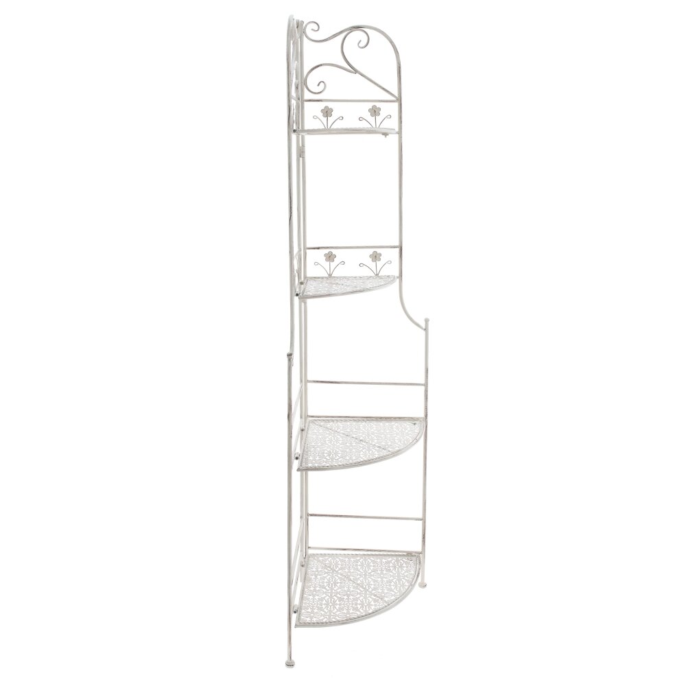 Эта изящная металлическая этажерка станет отличным украшением любого интерьера. Она идеально впишется даже в небольшое помещение, позволяя рационально использовать угол комнаты. Конструкция этажерки выполнена из прочного металла, что обеспечивает долговечность и устойчивость изделия. На четырёх полках с ажурным узором удобно размещать цветы, книги, декоративные фигурки либо аксессуары для хранения мелочей. Светлый цвет и витиеватые линии элементов придают этажерке винтажный, элегантный и одновременно универсальный вид. Такая угловая этажерка отлично подойдёт для гостиной, балкона, кухни или прихожей, добавив вашему пространству нотку романтики и уюта. Прекрасное решение для тех, кто ценит стиль, практичность и функциональность.