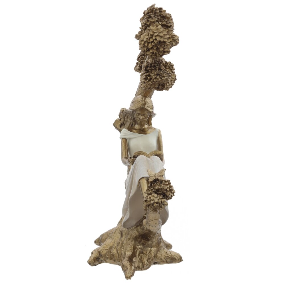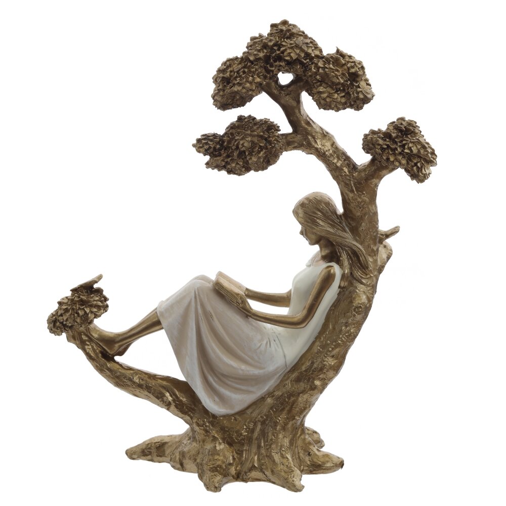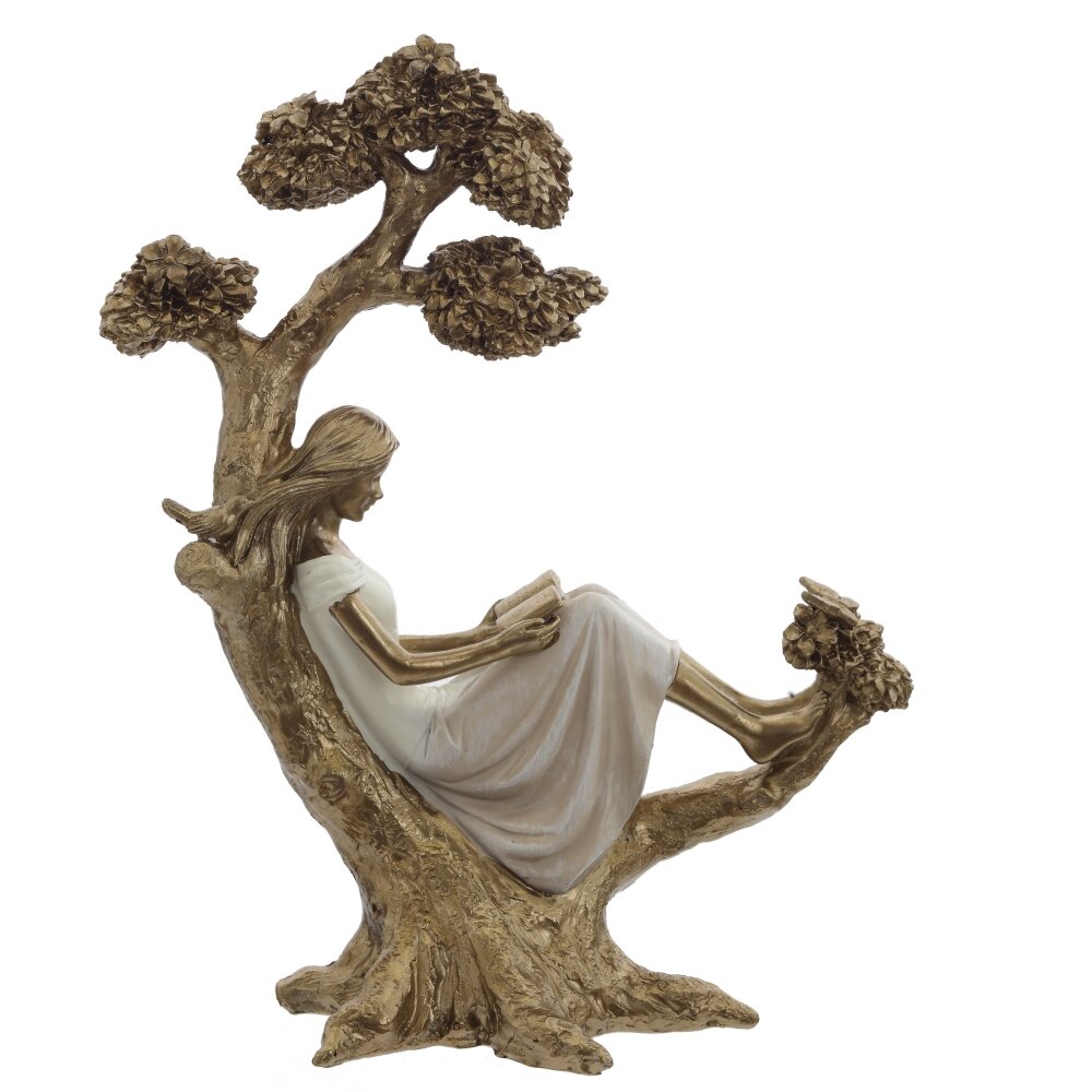 Очаровательная декоративная фигурка станет оригинальным подарком для всех любителей милых вещиц. Скульптура изображает стройную девушку в длинном светлом платье, удобно устроившуюся в ветвях раскидистого дерева с книжкой в руках. Золотистая фактура ствола и кроны с проработанными деталями создаёт ощущение теплого солнечного света, а мягкие линии силуэта придают композиции спокойствие и гармонию. Вы можете поставить эту фигурку в любом месте, где она будет удачно смотреться и радовать глаз. Прекрасно смотрится на любой поверхности.