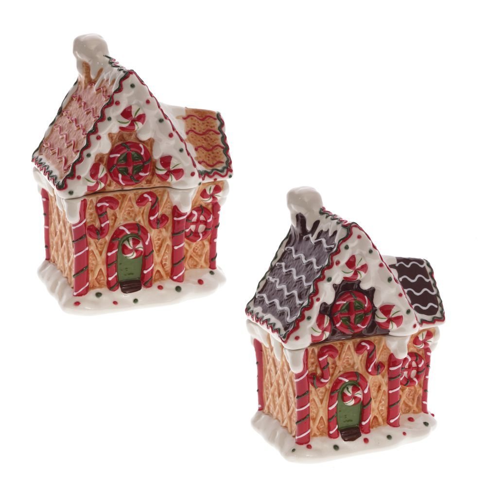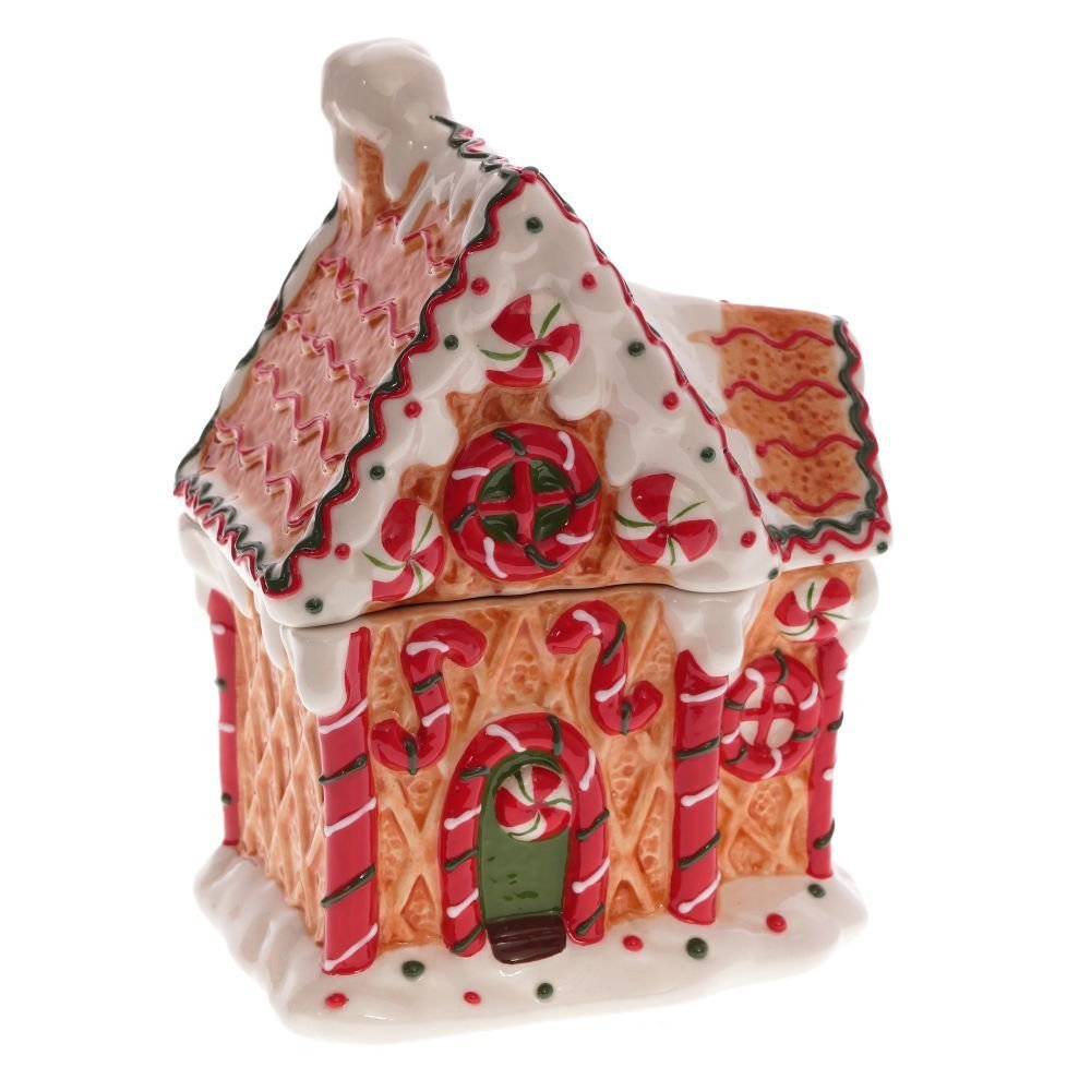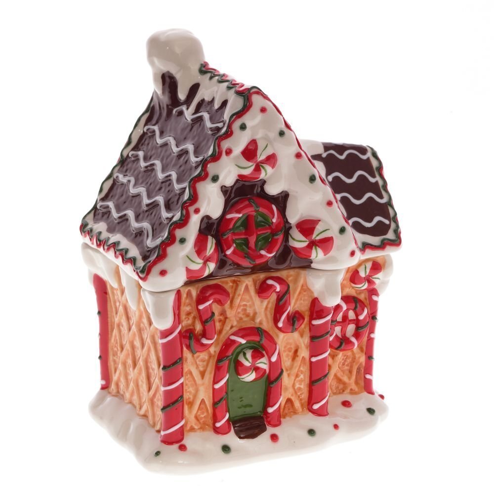 Керамическая конфетница "Сказочный дом" на 550 мл с праздничным рождественским дизайном. Она выполнена в коричневой цветовой гамме в форме пряничного домика.