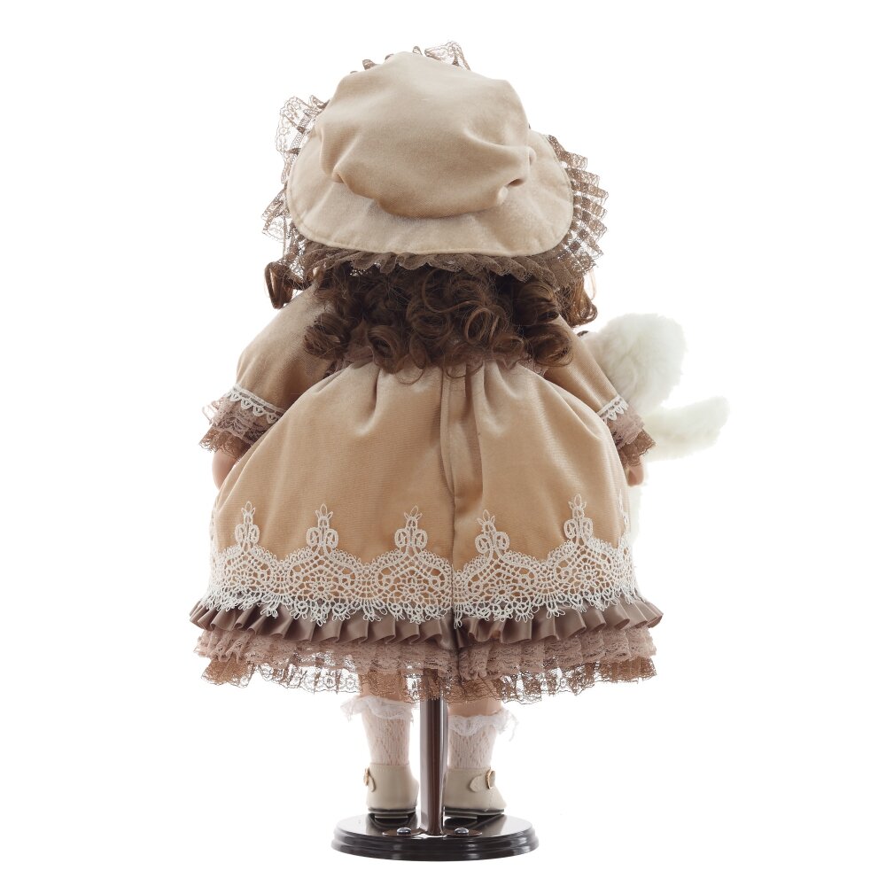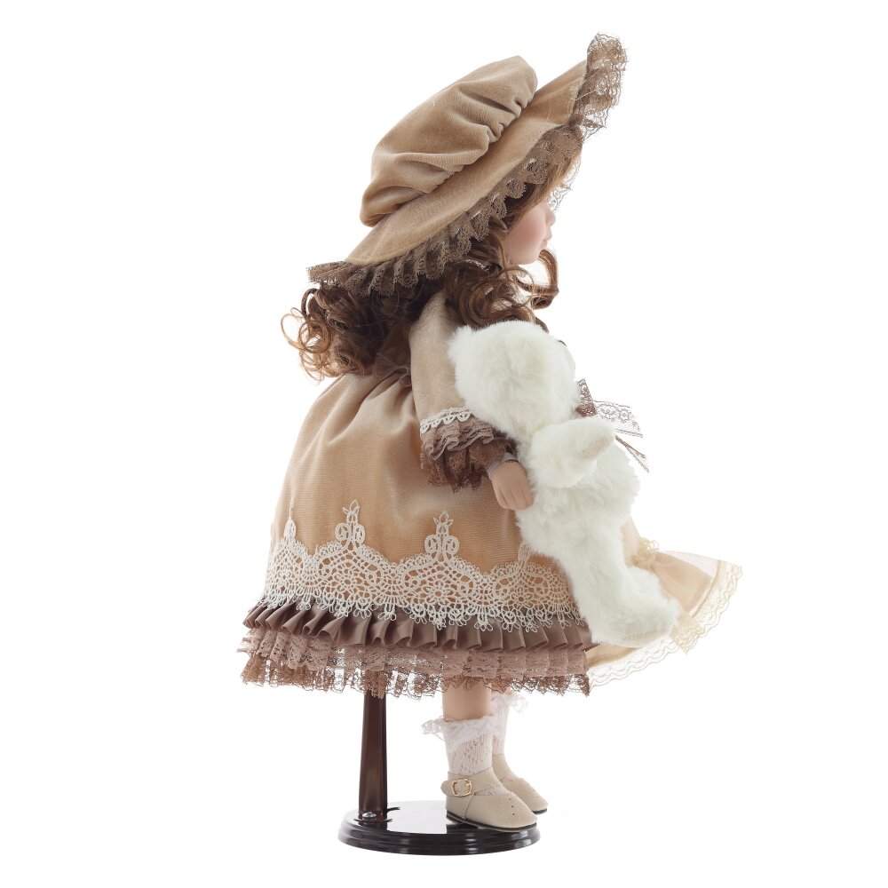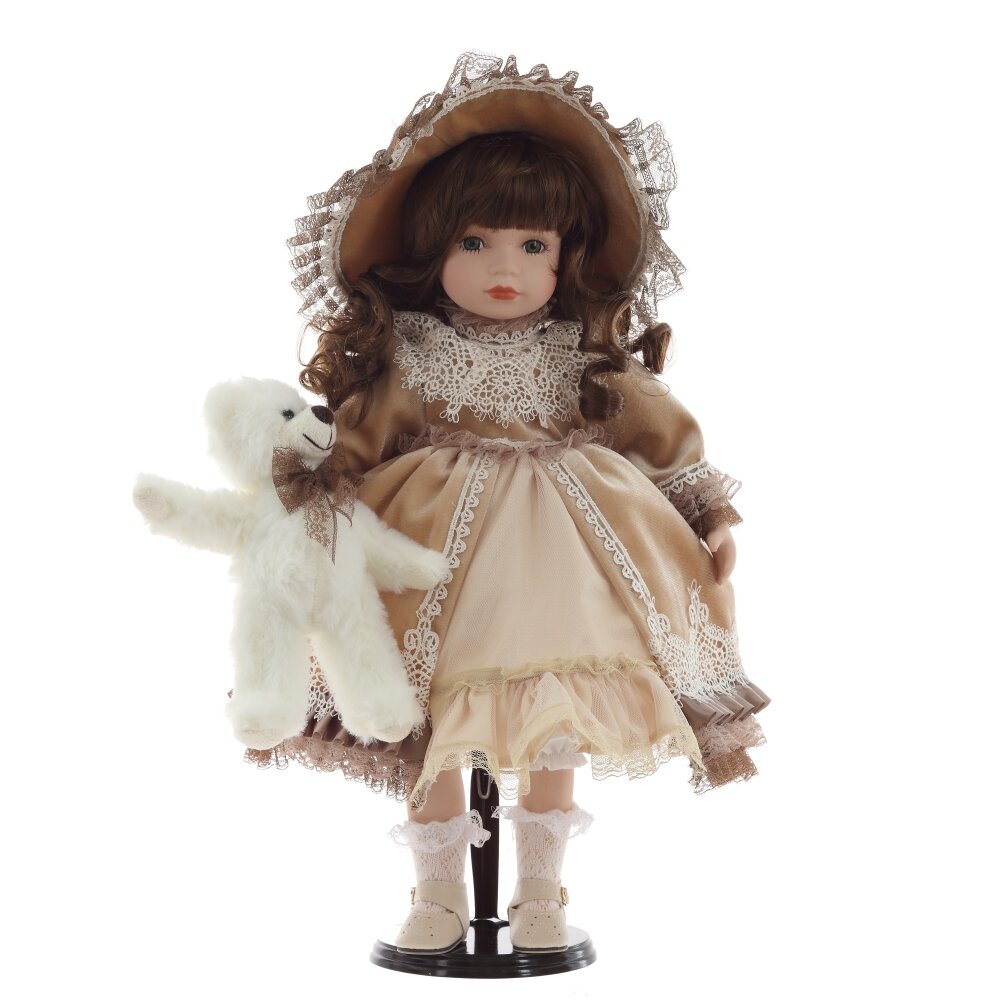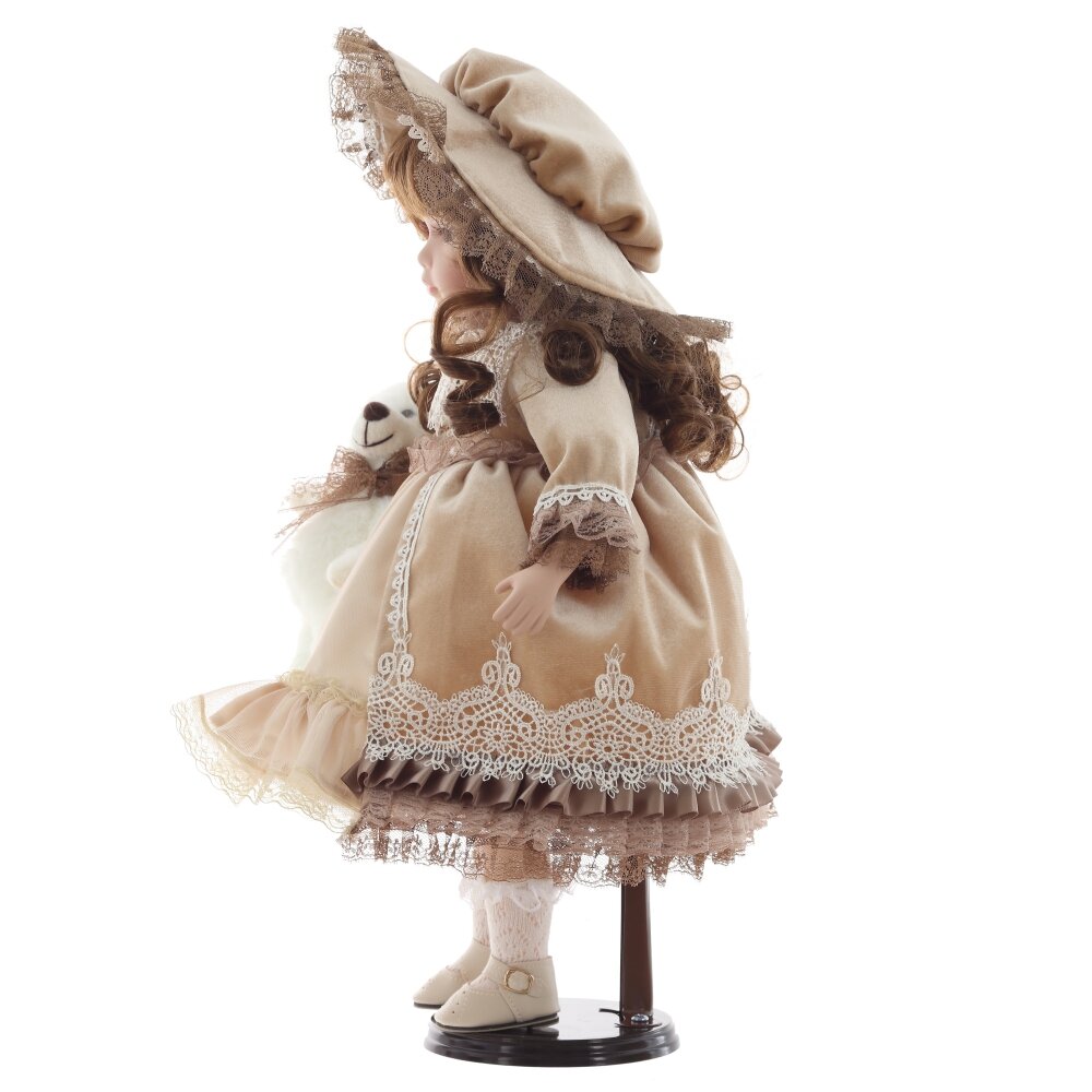 Элегантная коллекционная кукла в винтажном стиле станет прекрасным украшением интерьера и отличным подарком. Она одета в роскошное платье бежевого цвета с кружевной отделкой, дополненное многослойной юбкой из кружева. На голове у куклы изящный головной убор, гармонирующий с нарядом. У куколки реалистичные черты лица, выразительные глаза и аккуратно уложенные волосы. В руках она держит милого белого плюшевого медвежонка с кружевным бантом. Кукла установлена на специальную подставку для удобного размещения. Этот изысканный предмет создан для коллекционеров и любителей классических кукол