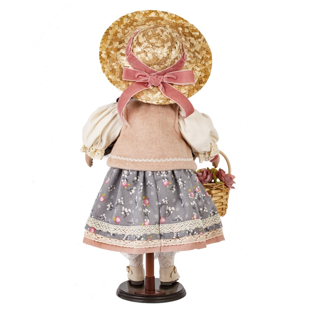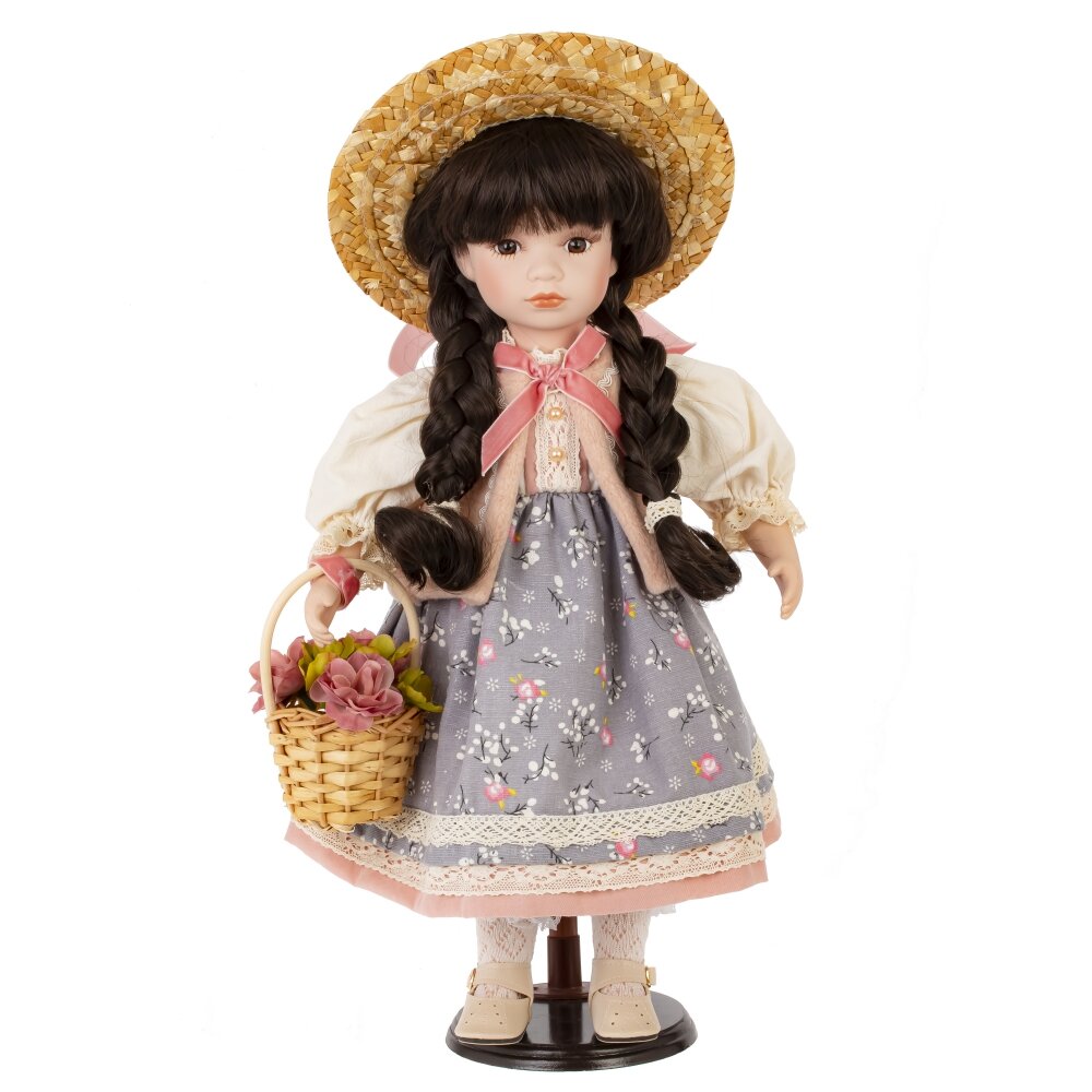 Представляем вам очаровательную фарфоровую куклу, которая станет настоящим украшением вашей коллекции или желанным подарком для любимого человека. Её нежные черты лица, румяные щечки и выразительные глаза очаровывают с первого взгляда. Длинные волосы заплетены в две аккуратные косички, а на голове красуется очаровательная шляпка. Кукла облачена в пышное розовое платье с цветочным принтом. Нежный материал платья и искусная отделка придают образу куклы особую женственность и очарование. В изящной ручке кукла держит плетеную корзинку, наполненную цветами. Эта деталь добавляет образу куклы трогательности и очарования. Эта кукла станет прекрасным подарком для девочки, девушки или женщины, которая ценит красоту и изящество.