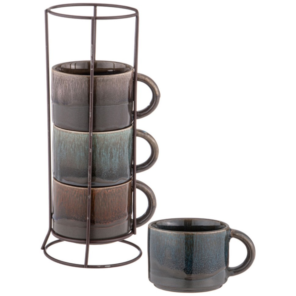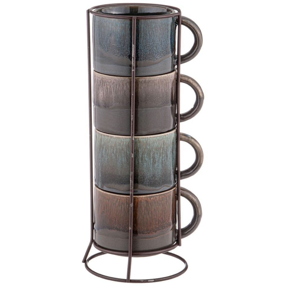 Набор состоит из 4 кружек и подставки. Кружки изготовлены из глазурованной керамики. Теплостойкие ручки обеспечивают комфортное использование. Кружки подходят для горячих и холодных напитков. Изящный дизайн придется по вкусу и ценителям классики, и тем, кто предпочитает современный стиль. Он настроит на позитивный лад и подарит хорошее настроение с самого утра. Изделия можно компактно хранить на подставке, входящей в набор. Набор кружек - идеальный и необходимый подарок для вашего дома и для ваших друзей на праздники, юбилеи и торжества.