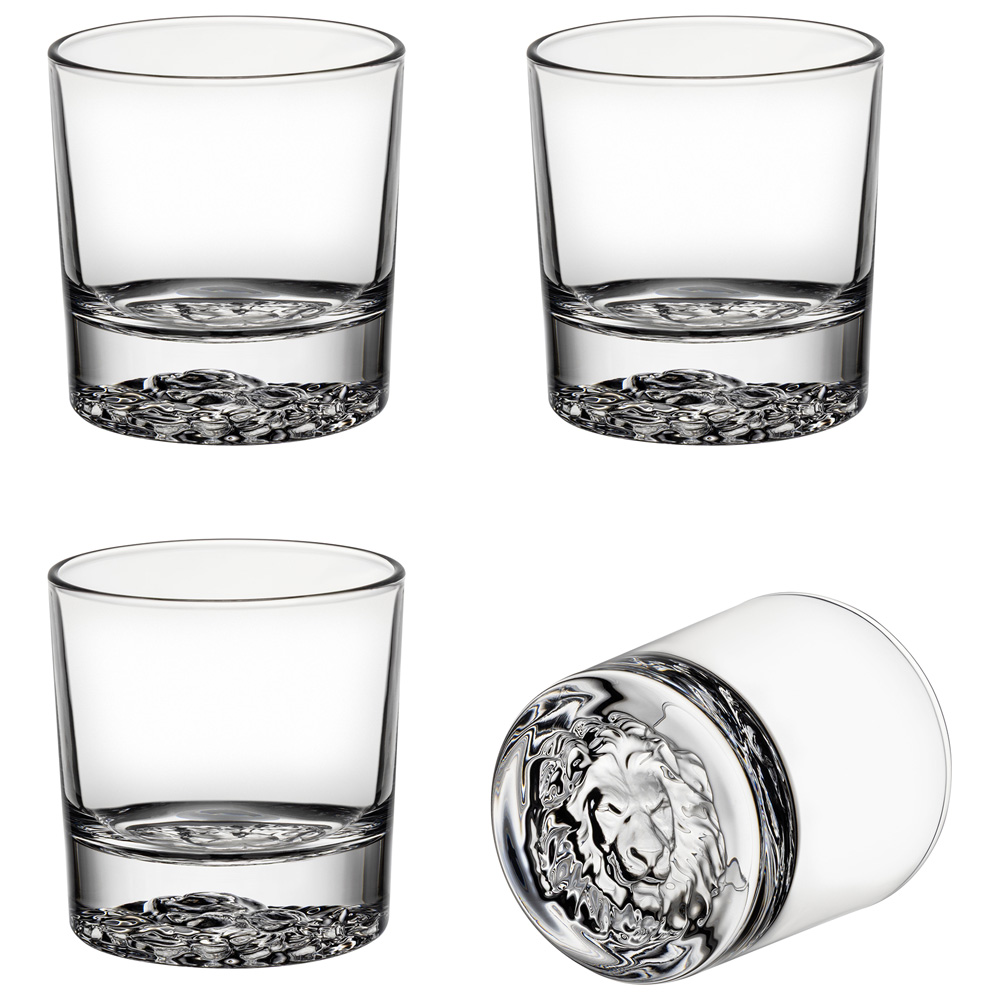 Набор стаканов для виски "Lion" — это триумф классического дизайна и королевского стиля. Стакана, выполненные из прочного прозрачного стекла, украшены рельефной головой льва на дне — символа силы, мужества и благородства. Гладкие, лаконичные стенки акцентируют внимание на детализированном рельефе, который играет светом и придает напитку особую глубину и загадочность.