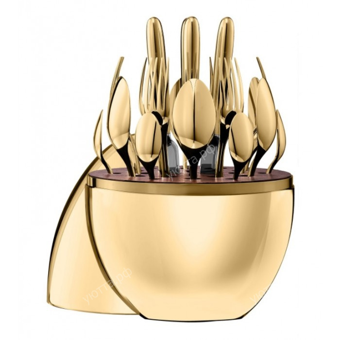 Набор расcчитан на шесть персон. Столовые приборы станут прекрасным дополнением к посуде любого типа и к различной обстановке. Благодаря своей красоте и сиянию, эти приборы настраивают посетителей на праздничный лад и задают трапезе тон.