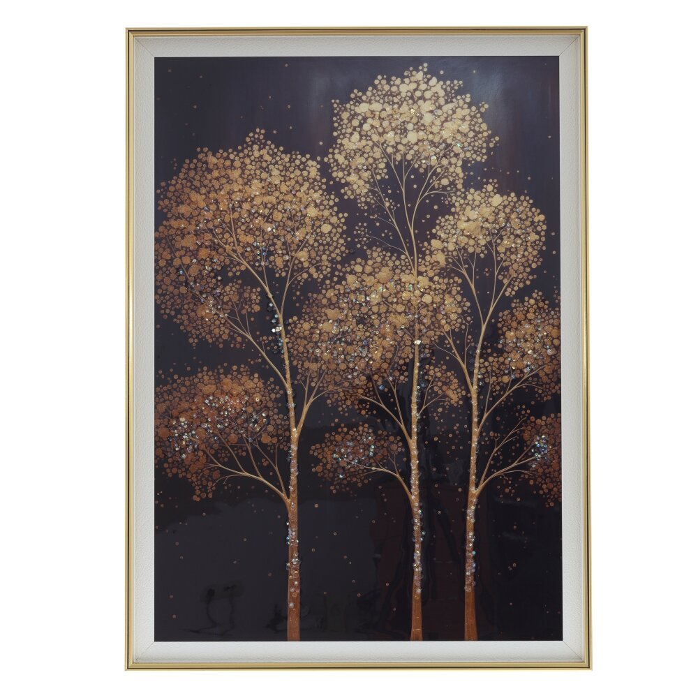 Элегантное настенное панно с кристальным декором, оформленное в светлой раме с тонкой золотистой кромкой. На глубоком темном фоне изображены три изящных дерева с тонкими стволами и кружевными кронами из множеств золотистых точек. Прозрачные кристаллы рассыпаны по ветвям, мерцают и создают эффект росы или далеких звезд, добавляя картине объем и игру света. Теплые медно?янтарные оттенки мягко контрастируют с ночным небом, наполняя пространство ощущением уюта и легкой торжественности. Панно гармонично впишется в современный, классический или ар-деко интерьер гостиной, спальни или холла, став выразительным акцентом стены.