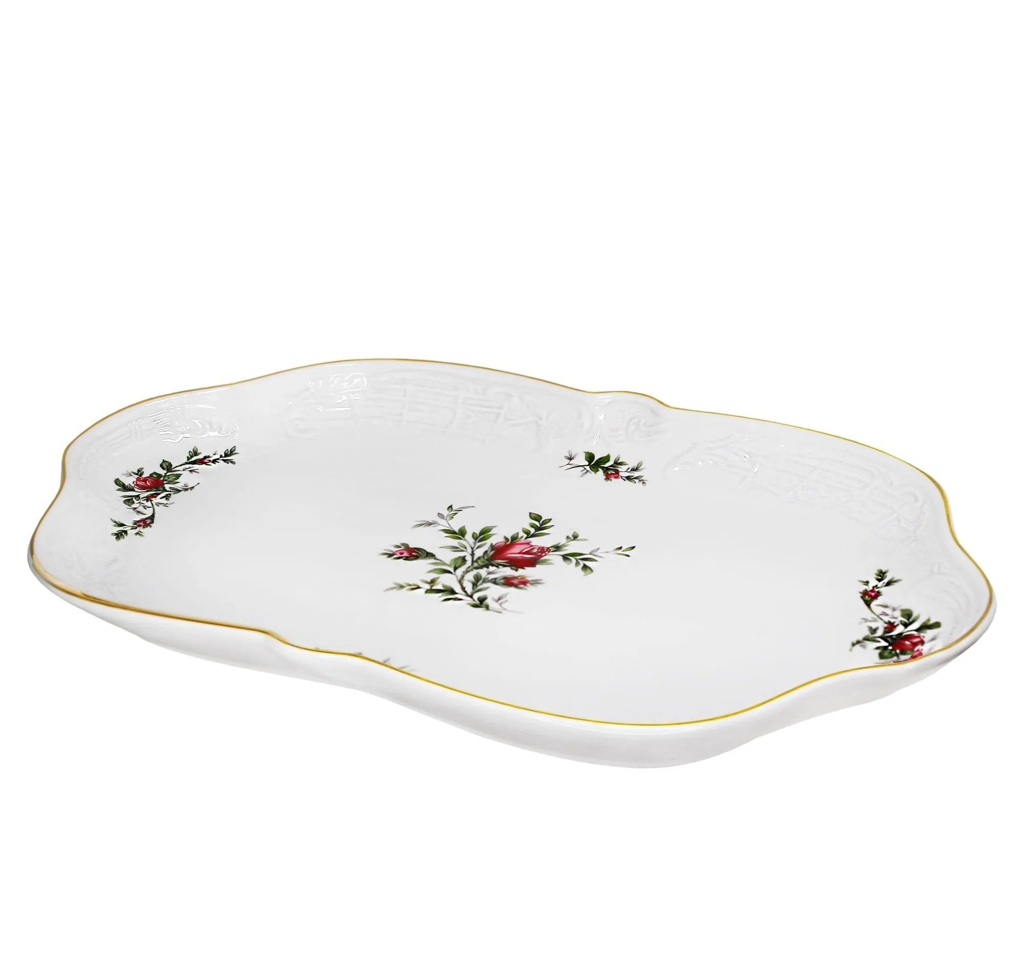 Коллекция Доминика выполнена в стиле барокко и производится из белого фарфора c золотой каймой. Изделия украшены рельефным декором, изящно подчеркивающими благородство фарфора, узорные края выглядят элегантно и всегда в тренде посудной моды. В росписи фарфора излюбленным цветком считается роза, вот и мы решили расписать коллекцию английскими розами.