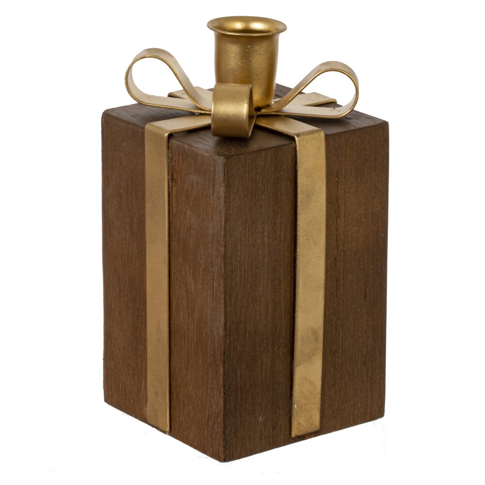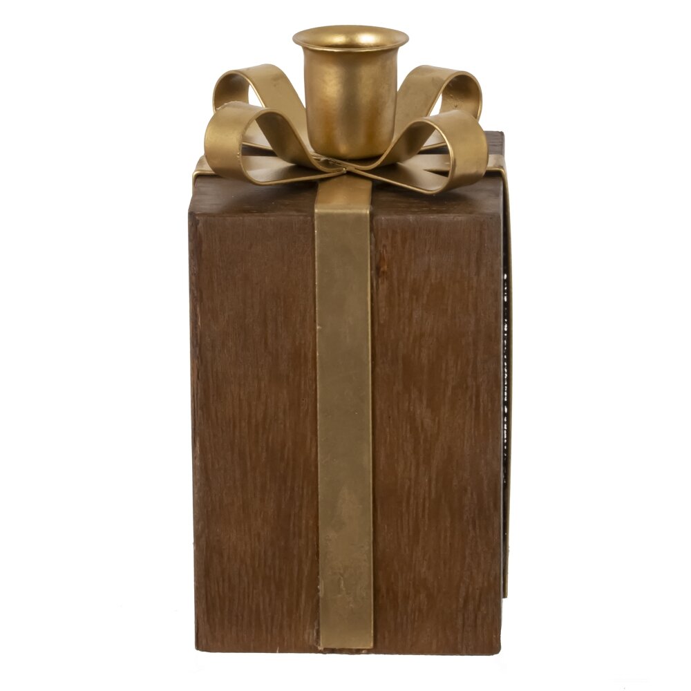 Оригинальный подсвечник, выполненный из металла и дерева. Его конструкция напоминает красиво завёрнутый подарок: основа выполнена в виде деревянного куба, украшенного золотистыми металлическими "ленточками" и бантом. На верхней части композиции расположен металлический держатель для свечи диаметром 2 см. Такая необычная форма делает подсвечник не только функциональным предметом, но и ярким декоративным акцентом в интерьере. Благодаря сочетанию теплого оттенка дерева и благородного блеска металла, изделие идеально впишется как в классический, так и современный стиль оформления пространства. Подсвечник прекрасно подойдет для создания уютной атмосферы дома, украшения праздничного стола или в качестве подарка близким людям.