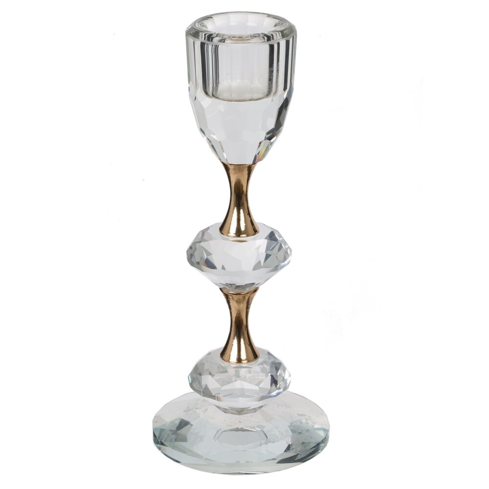 Элегантный подсвечник из стекла станет изысканным украшением вашего интерьера. Он выполнен из высококачественного прозрачного стекла с граненой поверхностью, что придает изделия роскошный и утончённый вид. Акцентом служит изящный элемент золотистого цвета, который соединяет верхнюю и нижнюю части подсвечника. Благодаря классическому дизайну и блестящей отделке этот подсвечник прекрасно впишется как в современный, так и в классический интерьер, добавив нотку стиля и уюта. Идеален для романтических ужинов, праздничных мероприятий или просто для создания теплой, уютной атмосферы в вашем доме. Подсвечник устойчив и подходит для стандартных свечей диаметром 2 см. Прекрасный вариант подарка на любой праздник.