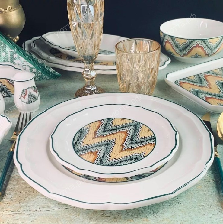 Тарелка станет отличным дополнением к набору кухонной посуды и прекрасно подойдет для сервировки как обеденного, так и праздничного стола. Выполнена из абсолютно безопасного материала — фарфора, который не вступает в реакцию с продуктами, а также не влияет на запах и вкус.
