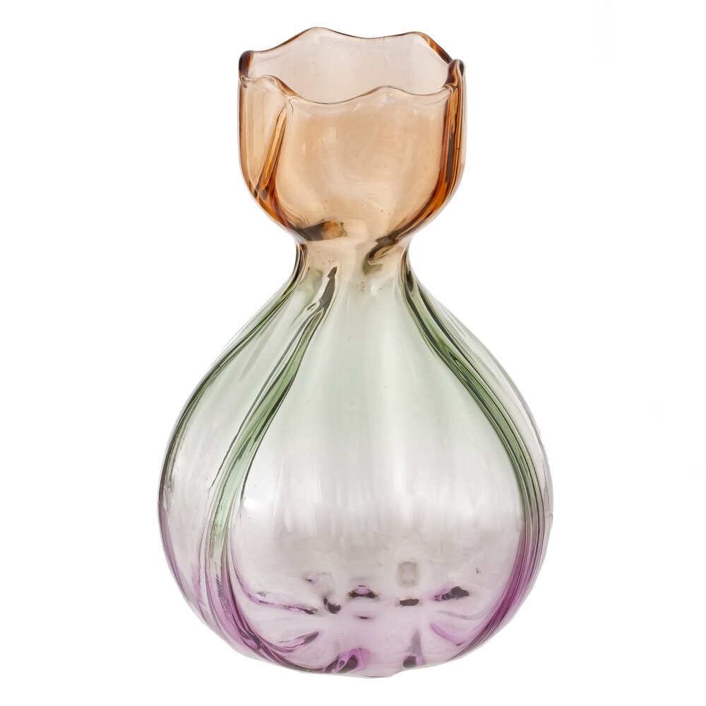 Компактная декоративная ваза из стекла объемом 150 мл. Имеет грушевидный силуэт с узким горлышком и волнистым краем в теплых янтарных оттенках. Основной корпус прозрачный с мягким градиентом от светло?зеленого к лиловому; рельефные диагональные линии создают игру света и подчеркивают форму. Идеальна для одной?двух веточек, мини?букета, сухоцветов или ароматических палочек. Уместна на прикроватной тумбе, рабочем столе, на подоконнике или в ванной. Легкая, но устойчивая, станет акцентом в интерьерах от современного до бохо. Уход: промывать теплой водой, протирать мягкой салфеткой, избегать абразивов и резких перепадов температуры.