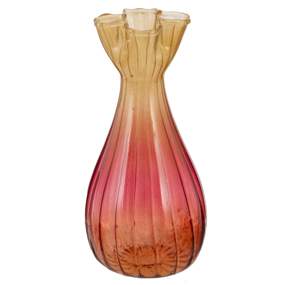 Элегантная стеклянная ваза объемом 320 мл. Корпус грушевидной формы с вытянутыми продольными ребрами, плавный градиент от теплого медово?янтарного оттенка к насыщенному розово?терракотовому у основания. Волнистое, слегка присборенное горлышко создает эффект ручной работы и добавляет воздушности. Компактный размер подходит для одной?двух веток тюльпанов, еустомы, полевых трав или сухоцветов; можно использовать как ароматический диффузор. Устойчивая округлая донышко и глянцевая поверхность красиво играют на свету. Вписывается в интерьеры сканди, модерн и бохо, становится ярким акцентом на подоконнике, тумбе или рабочем столе. Уход: мыть мягкой губкой без абразивов, не рекомендуется посудомоечная машина. Отличная идея для небольшого подарка или дополнения к букету.